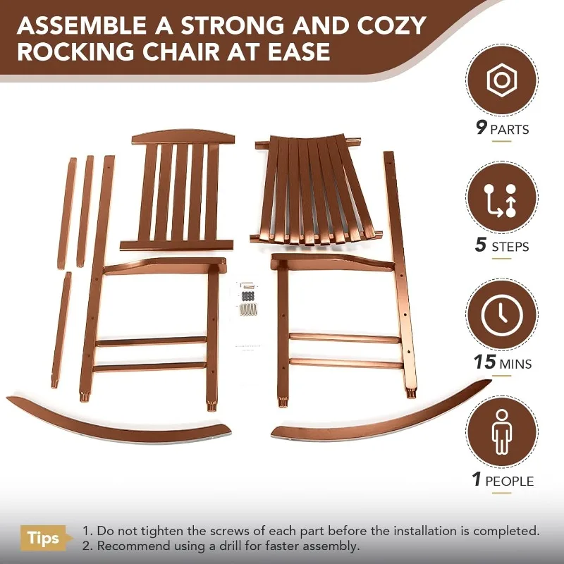 15 MINUTES INSTALLATION:The outdoor rocker only takes one person to install, takes five steps, and takes about 15 minutes to assemble into a comfortable chair.You can follow the steps in the instructions, or you can refer to the video on our home page for easy understanding.